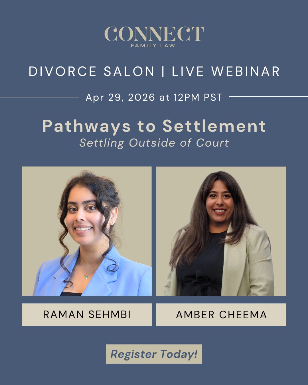 Join Raman Sehmbi of Connect Family Law and Amber Cheema of Kitsilano Family Law on April 29 at 12:00 PM PST on Zoom for our upcoming Divorce Salon, Pathways to Settlement: Settling Outside of Court.